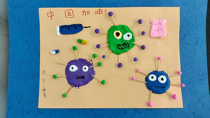 最后的作品是《消灭病毒》,可以看到孩子对新冠病毒的深恶痛绝——害他只能被关在家里。看那个绿色的病毒,眼睛都被打出血了,小作者创作时的愤怒之情简直溢于言表。