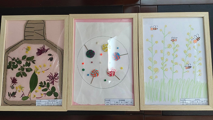 《把春天装进瓶子里》和《春暖花开》,孩子都是巧用春天花坛树下捡到的落叶、花瓣进行拼贴,但呈现出的效果却截然不同,可以看出花了心思,虽然简单却富有不一样的春意。