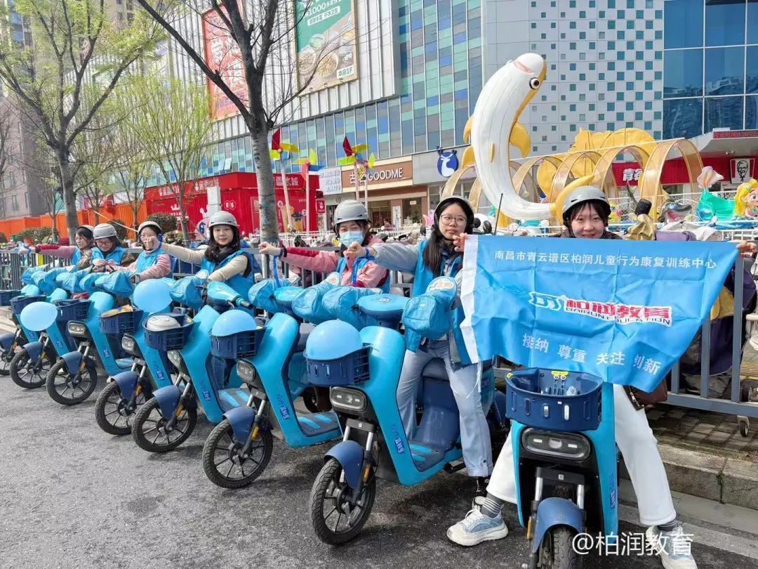 4月1日上午,阳光正好,柏润教育的老师们身着蓝色马甲,骑着插有蓝旗的电车,化身“蓝色信使”,开启关爱孤独症儿童户外骑行宣传活动。