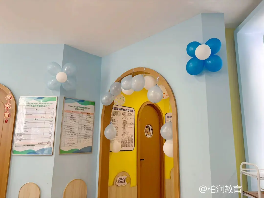 孤独症日当天,柏润教育中心被爱意包裹,大厅、教室以蓝色为主调精心装扮,气球、彩带点缀其间,如温柔星空,既呼应“星星的孩子”,也为他们打造了温馨治愈的家园。