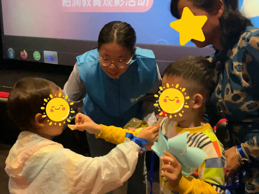 签到、检票、系上蓝丝带,中心教职工们扮演检票员,带孩子们体验完整的观影流程。中心还为孩子们准备了爆米花、可乐、零食等。