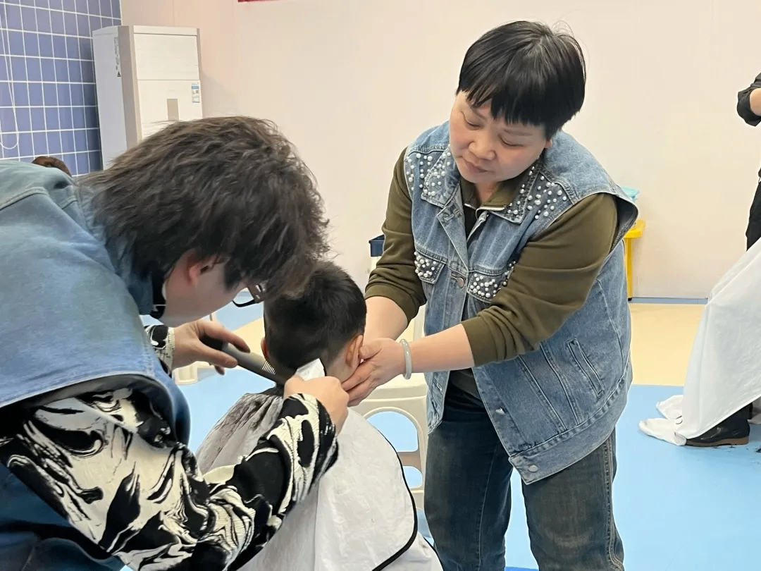 在活动中,孩子们在老师的指引下有序排队,等待理发。